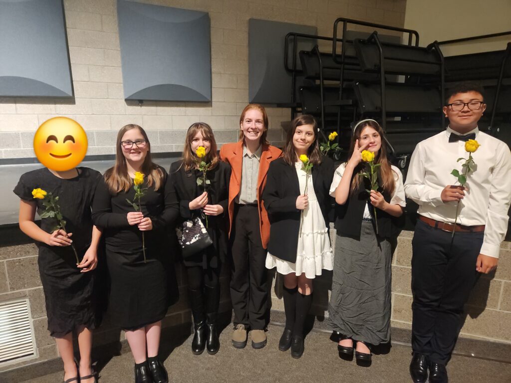 Our kids did amazing at our District Choir Concert. From left to right: Anonymous, Emma DeSplinter, Makayla Brinkerhoff, Ms. McDonald, Amy LaPuma, Athena (Ayat) Alsabsabi, Lamyanba Ningthoujam. NOT PICTURED: Lillian Green, Tanay Sinha, Marcos Cid Baena